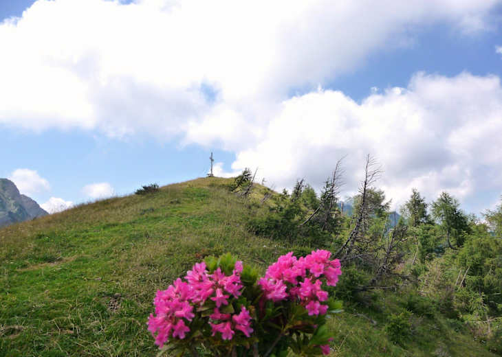 Nach einer kurzen flachen Querung geht es in der Kehre entlang des Sommersteiges links durch den Wald, teils sehr steil bergauf, bis man in 1.300 m ein paar Hütten erreicht. Nun geht es anfangs noch mäßig steil, später immer steiler werdend durch lichten Buchenwald entlang der Sommermarkierung höher bis man in rund 1.450 m wieder deutlich flacheres Gelände erreicht. An einer Almhütte vorbei, nochmals kurz durch den Wald. Über schöne Almwiesen über den Rücken bis zum Gipfel.