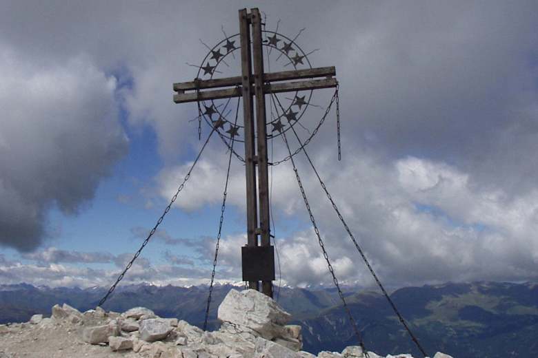 Weiter geht es zum Filmoorsattel und über das Geröllfeld südlich der Königswand etwa 400 m in westl. Richtung. Rechts abzweigend, sehr steil durch die Schotterhalde bis zum Felsen, wo eine versicherte Passage mit rund 100 m Länge zum Gipfelkar wartet. Dann rechts weiter zum Europakreuz auf den Gipfel, der die höchste Erhebung des Karnischen Kammes ist.
