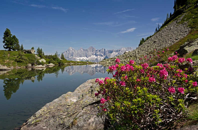 Die Wanderung hat bei Windstille ein besonderes Highlight zu bieten, denn dann spiegelt sich das Dachstein-Dreigestirn mit Torstein, Mitterspitz und Hoher Dachstein im Mittersee.