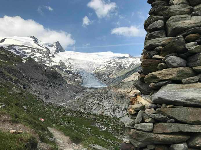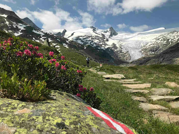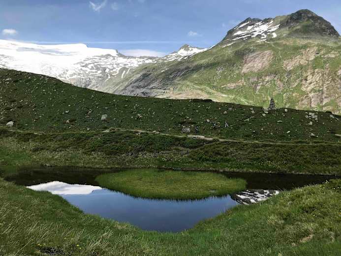 Hat man die Höhenmeter hinter sich gelassen, öffnet sich der fantastische Blick auf den Großvenediger mit dem Schlatenkees. Fast eben geht es über alpine Matten mit Almrosen, dem Salzbodensee und dem „Auge Gottes“, einem kleinen See mit einer Wollgrasinsel, vorbei. An den Wegweisern hält man sich immer an die Bezeichnung Gletscherweg, der tendenziell nach rechts leitet. Beim Steinmann geht es ein Stück abwärts, über die Brücke über den Bach und dann durch den farbenprächtigen und formschönen Gletscherschliff.