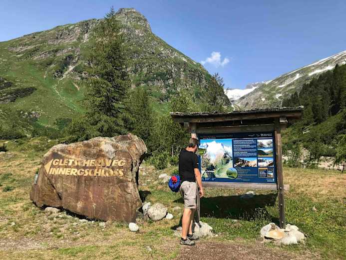Ein Wegweiser markiert noch den Abstecher zur Gletscherzunge, die sich schon weit zurück gezogen hat. Später erreicht man die Abzweigung Prager Hütte - Innergschlöß. Hier beginnt nun rechts der Abstieg ins Tal.