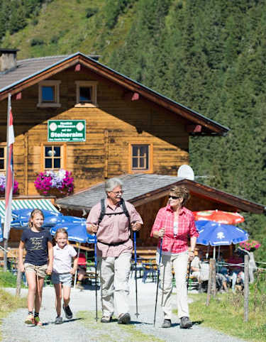 Ist der Hunger während dem Wandern schon groß geworden, kann man die Aussicht auf der Terrasse des Gasthofs Islitzer in Hinterbichl bei einer Stärkung genießen.