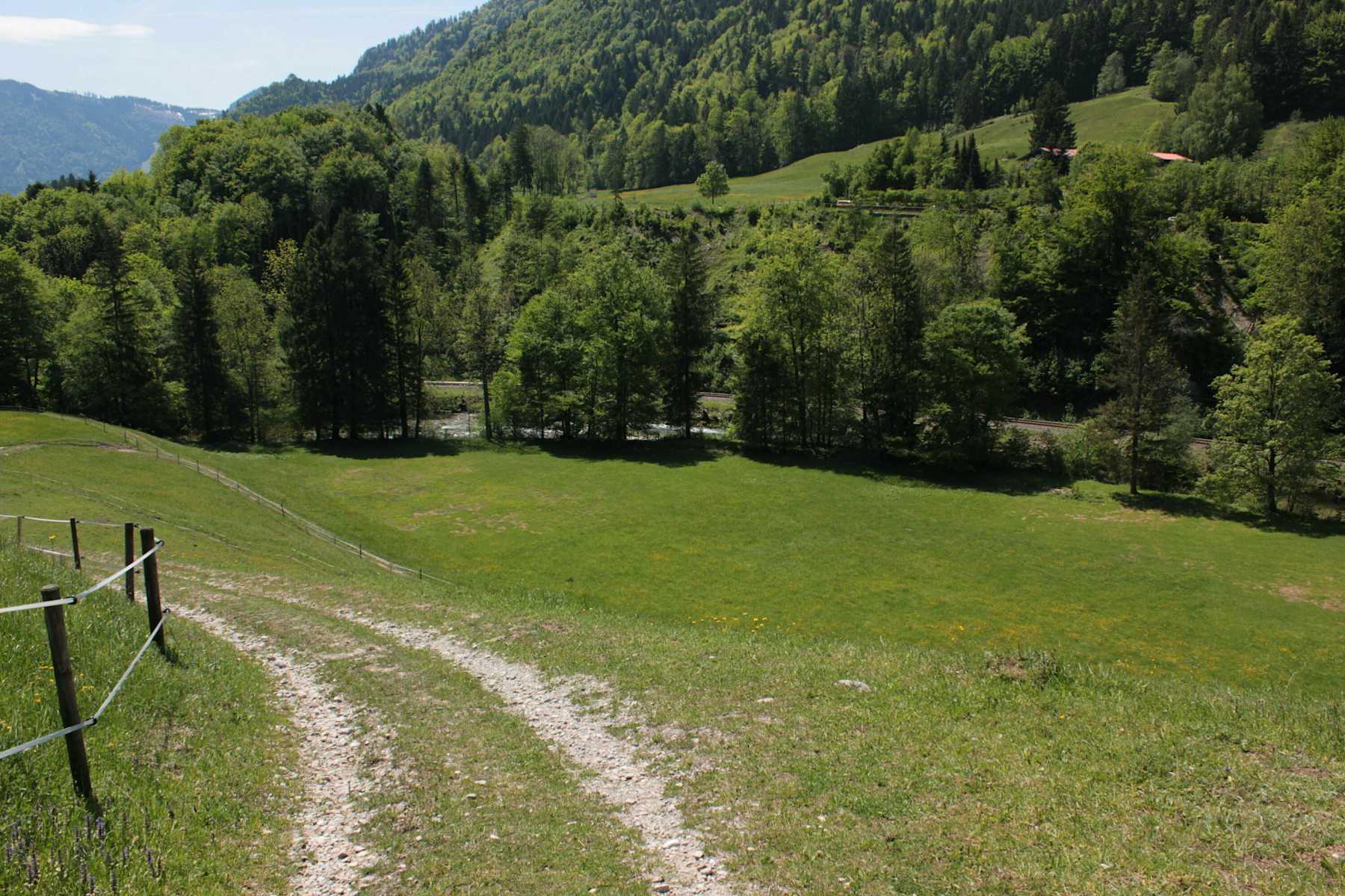 Der Weg führt weiter über den Höhenrücken des Zinnkopfs hinab bis nach Höpfling. Hier kann man einen kleinen Abstecher hinauf zur Fundstelle des Siegsdorfer Mammuts machen. Danach führt uns der Weg entlang der weißen Traun zurück zum Ausgangspunkt. Am Weg gibt es eine Einkehrmöglichkeit: Das „Pappilon" in Höpfling.