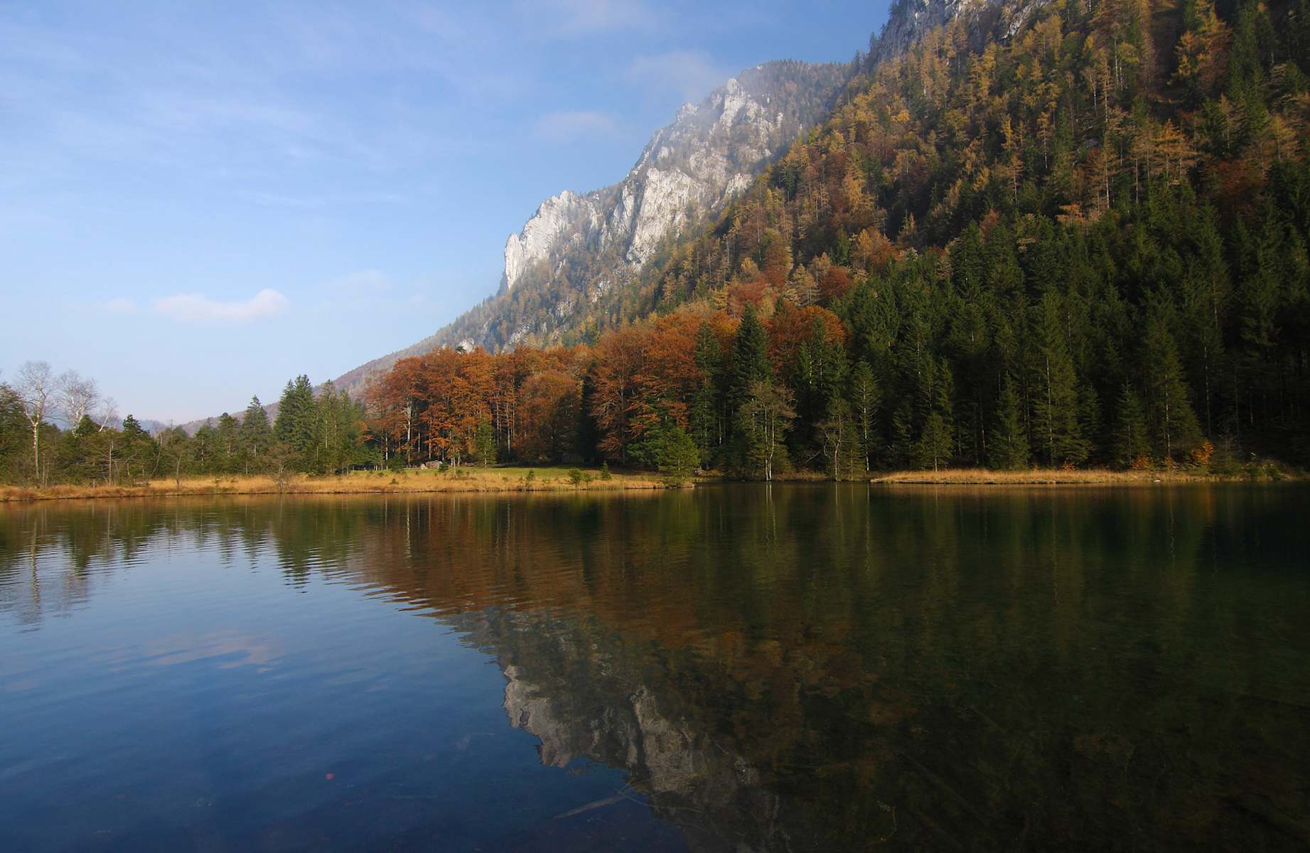 Bänke am Seeufer laden ein, die Ruhe des Sees mitten im Naturschutzgebiet Chiemgauer Alpen zu genießen und die Forellen im Wasser zu beobachten.