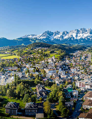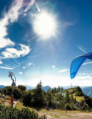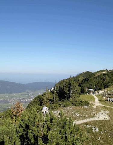 Von der Aussichtsplattform in 70 Metern Höhe bietet einen spektakulären Ausblick von den Chiemgauer und Berchtesgadener Alpen über die Loferer Steinberge bis hinein in die Hohen Tauern.