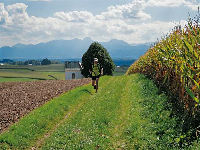 Vorher gilt es, gute 20 Kilometer zu bewältigen. Damit kommt ihr einem Halbmarathon schon gefährlich nahe. Knapp 350 Meter Höhenunterschied verteilen sich gut auf die gesamte Strecke, der Laufuntergrund besteht überwiegend aus Feldwegen, Wiesen, der ein oder anderen Teerstraße und insgesamt wenig Waldpfaden. Im Hochsommer ist die Tour im Münchner Umland deshalb nur morgens, abends oder mit entsprechendem Sonnenschutz ein Genuss.