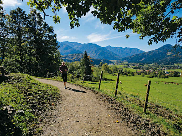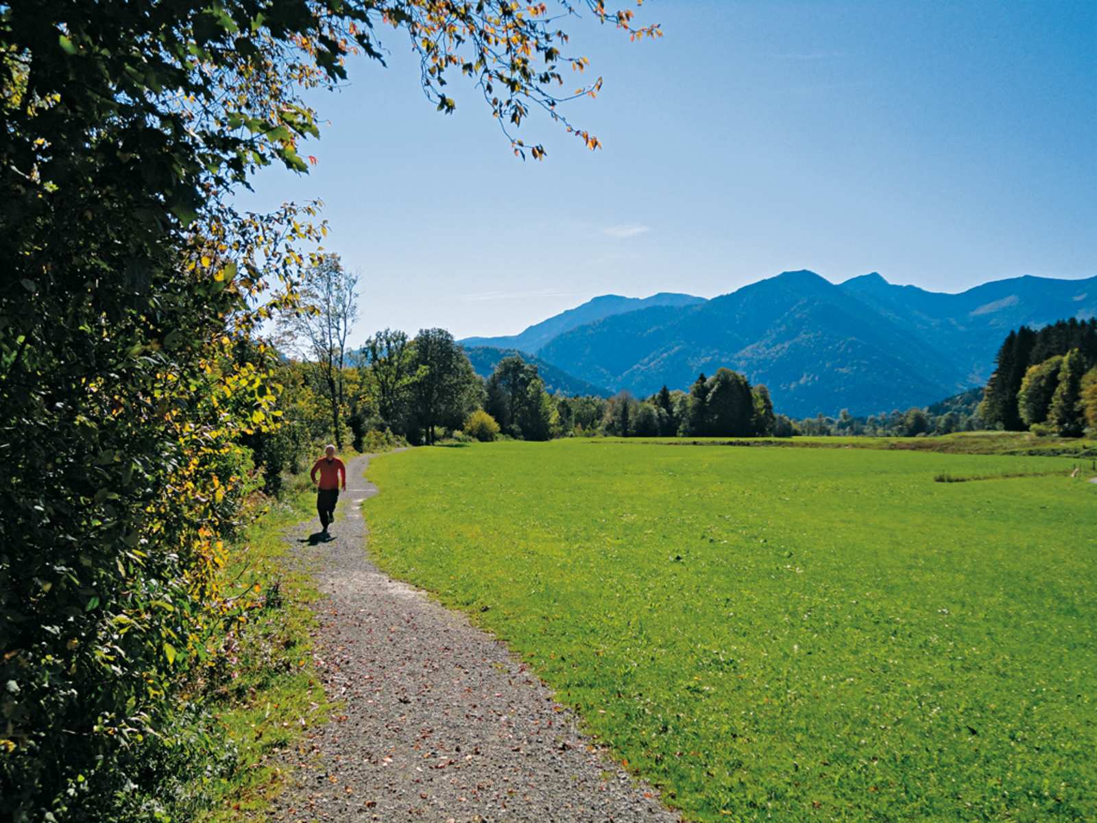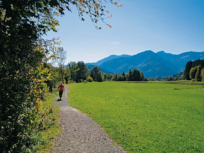 Auch der Hinweg direkt an der Leitzach in Richtung bayerische Fischbachau ist schon ein Juwel für sich. Der Fluss in Deutschland entspringt etwa 15 Kilometer weiter südöstlich im Sudelfeld und schlängelt sich munter durch die Auenwiesen der Region Fischbachau. Das ergibt im Rahmen dieser Runde eine über drei Kilometer durchgehende Laufstrecke auf reinem Wald- und Wiesenboden – mit garantiertem Bergblick. Wahre Wohltaten für Körper und Geist!