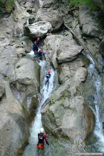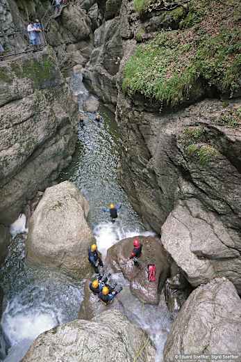 Canyoning-Gruppe beim Sprung.Foto: Eduard Soeffker, Sigrid Soeffker, Bergverlag Rother GmbH