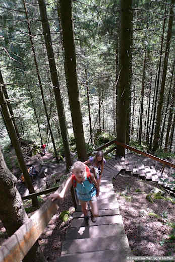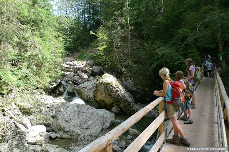 Ab 6 Jahren. Die Tour verläuft überwiegend auf kleinen Bergpfaden, die im Aufstieg mitunter sehr steil sind. In der Klamm ist der felsige Untergrund oft rutschig. Kleinere Kinder hier an die Hand nehmen! Im Bereich des Berggasthofes Alpenblick Asphalt- und Wirtschaftswege.
