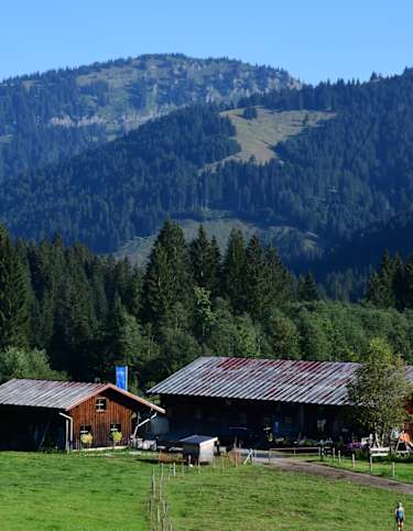 Alpe Topfen, 970 m, geöffnet Mitte Mai bis Okt., Brotzeiten, kein Ruhetag, Tel. +49 8321 71114, fewo-laemmerhofer.de.