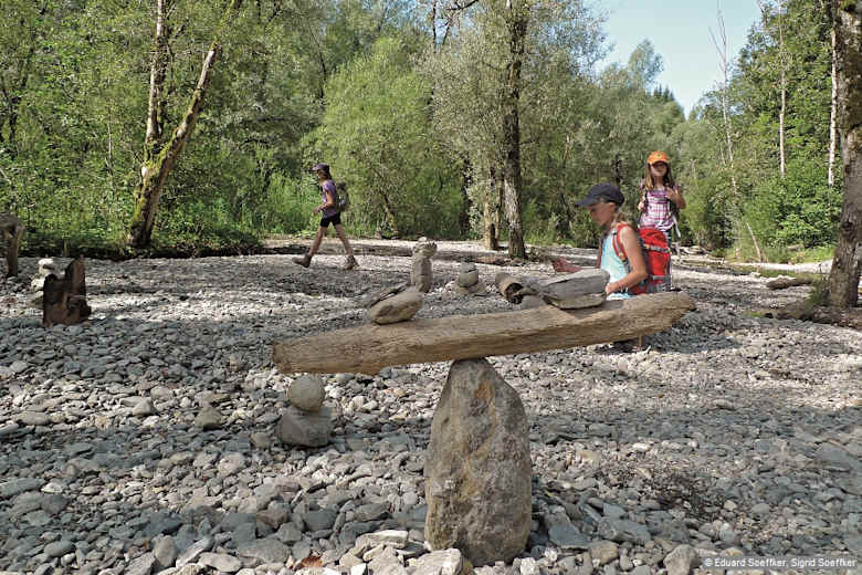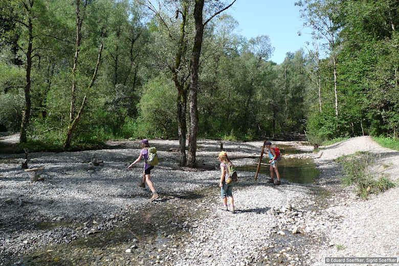 Die Kinder sind begeistert von den Verzweigungen der Starzlach im Kiesbett.Foto: Eduard Soeffker/Sigrid Soeffker/Bergverlag Rother