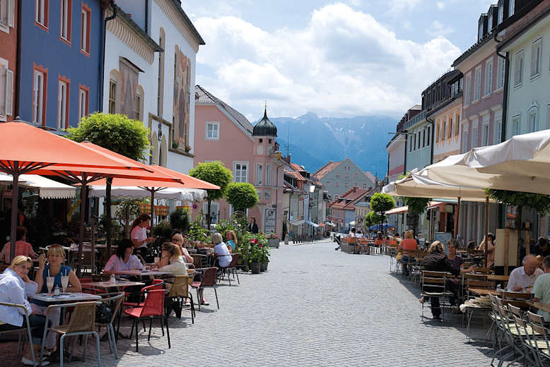 Oben passieren wir rechter Hand das ehemalige Weinhaus Kirchmeir (Haus von 1840, mit goldener Traube am Turmerker, Tafel zur interessanten Vergangenheit und zum Schriftsteller Ödön von Horváth). Dahinter sehen wir das Rathaus mit dem Fresko Kaiser Ludwigs des Bayern (der Murnau 1322 das Marktrecht verliehen hatte). Wir verlassen bei der Mariensäule den Markt und spazieren linker Hand aufwärts über die Postgasse zum Murnauer Kultur- und Tagungszentrum.