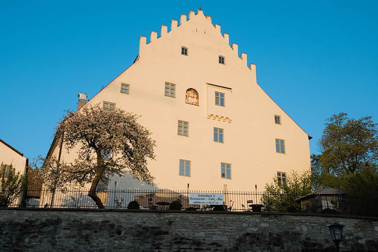 Unmittelbar nach der Kirche biegen wir links in die Grüngasse ein. Eine Tafel bei Hausnummer 4 verrät mehr über Kandinskys Bild „Grüngasse“ von 1909. Wir gehen die Gasse geradeaus weiter, rechts in die Pfarrstraße und links die Stufen hinauf in den Hof des ehemaligen Schlosses von Murnau.