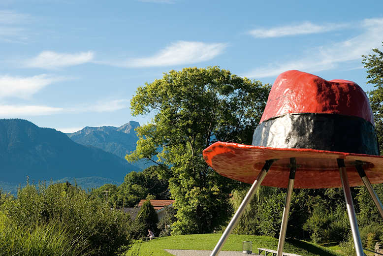 Wir überqueren die Straße an der Ampel, vor dem Gebäude wenden wir uns erst links, dann rechts abwärts in den Murnauer Kurpark. Einige Meter weiter erinnert ein Denkmal in Form eines überdimensionalen roten Hutes an den Schriftsteller Ödön von Horváth.