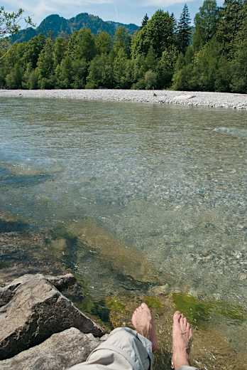 Anschließend folgen wir dem „Bad Tölz“-Schild nach rechts und gehen längere Zeit an der Isar entlang, an der kleine Bade- und Rastplätze immer wieder einladen. Über die Isarbrücke queren wir den Fluss anschließend nach links und gehen beim Kreisverkehr rechts in den Kalkofenweg. Bald passieren wir rechts ein schönes Haus, dessen „blumige Zitate“ auf den Hausmauern zum Lesen einladen.