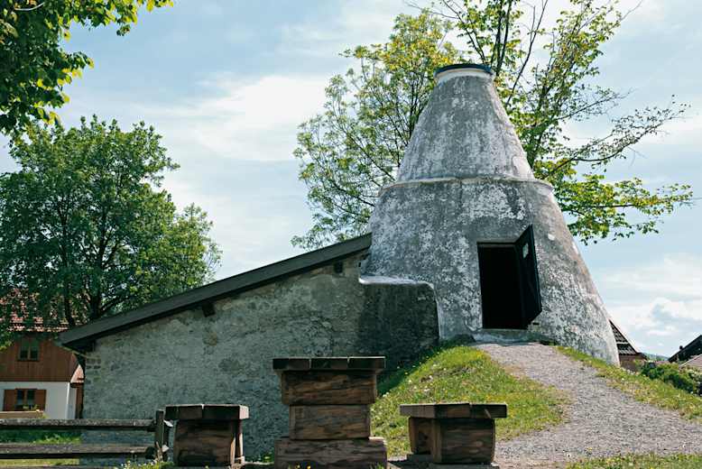 Gleich danach steht rechts ein alter Kalkofen. Er ist als einer der letzten seiner Art erhalten. Auf der Rückseite kann man in den Vorraum eintreten. Tafeln erklären die Funktion des Ofens, in dem durch mehrtägiges Brennen bei 1000 Grad der frische Kalkstein zu Baumaterial veredelt wurde.