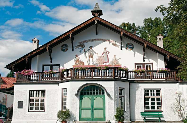 In die Hans-Miederer-Straße biegen wir rechts ein. Wir passieren schöne Häuser, der „Wagner hinterm Weinberg“ (Nr. 7) geht auf das 18. Jahrhundert zurück. Nach diesem Haus und vor der nächsten ansteigenden Linkskurve biegen wir rechts in einen unscheinbaren Forstweg ein. Er führt uns hinab zum Radspielerhaus. Es geht auf das Jahr 1474 zurück und ist ein typisches Beispiel für die Wohnhäuser der Schlierseer Handwerkerfamilien.