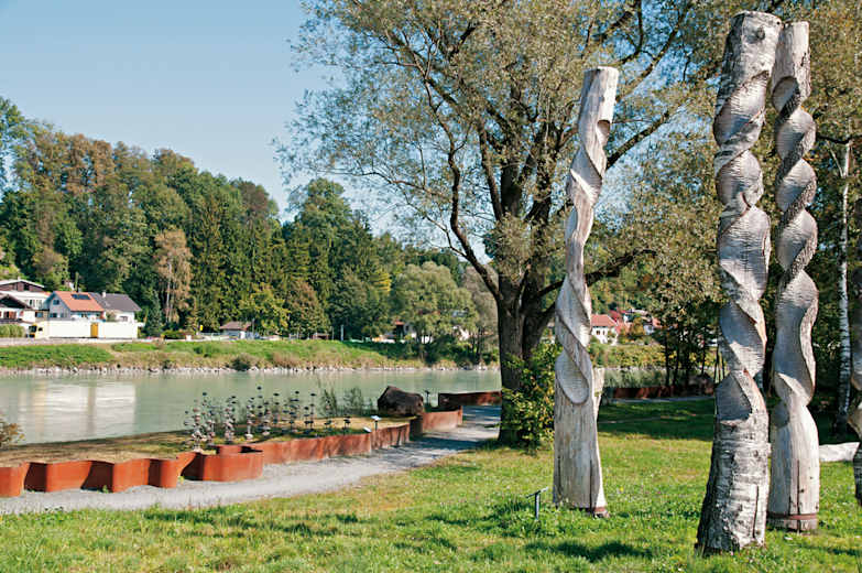 Das Freigelände Innmuseum ist der kostenlos zugängliche Außenbereich des Innmuseums. Ein Metallband symbolisiert den Verlauf des Inns vom Schweizer Malojapass bis Passau, Gesteinsbrocken erläutern den geologischen Verlauf. Künstler errichteten aus Schwemmholz eindrucksvolle Formationen. Wir gehen bis zur Pegelstandsanzeige an einem Haus, wo rechts eine alte Arche gezeigt wird, dann wieder zurück.