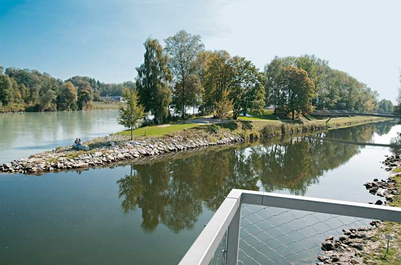 Vor der Kurve verlassen wir sie nach rechts und gehen auf einer Brücke über den Hammerbach. Vor der nächsten Brücke machen wir links einen Abstecher zu einer Aussichtsplattform, von der aus wir die Mündung der Mangfall in den Inn großartig überblicken können. Wir gehen zurück und links zu einer Brücke über die Mangfall, nach ihr folgen wir rechts dem Schild zum Inn-Museum.