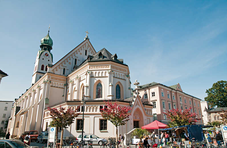 Wir wandern rechts an dem Springbrunnen vorbei und bleiben auf dem Weg, immer links am Kongressgebäude vorbei. Die anschließende Querstraße überqueren wir, dann halten wir uns rechts der Salin-Apotheke Richtung Salinplatz. Dieser hübsche Platz mit Geschäften und Cafés ist jünger, als er aussieht: In den Achtziger-Jahren wurde er anstelle der einstigen Saline erbaut.
