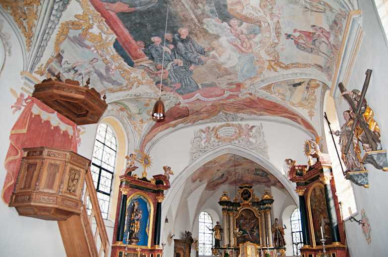 Links dahinter steht die Kirche St. Martin Walchstadt, ein schlichter Barockbau, der in der heutigen Form 1760 auf älterer Grundlage entstand. Gegenüber bei Hausnummer 1 steht das ehemalige Krameranwesen mit Satteldach von 1865. Man folgt dann der Alten Hauptstraße links hinab, und zweigt bald links ab auf die Hintere Seestraße, die bergab Richtung See führt (Schild zur „Roßschwemme“).