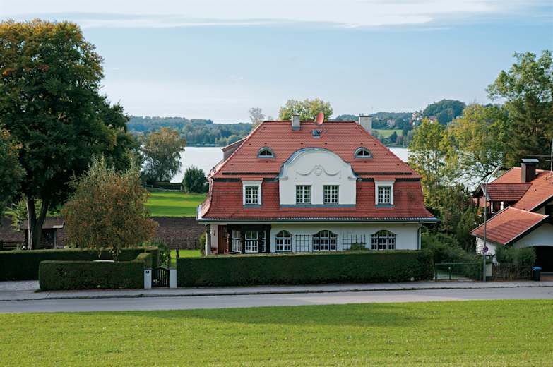 Man geht aus der Kirche hinaus und, links haltend, halb um sie herum. Am Friedhofsgatter kann man rechts zur Straße hinabgehen. Gegenüber liegt der Gasthof Raabe. Man folgt der Straße links (ÖPNV-Fahrer folgen ihr rechts zurück zur S-Bahn), zweigt bald links auf einen Fußweg ab, der mit schönem Tiefblick auf den See bergab führt. Man erblickt links unter uns die Künstlervilla von 1910 des Bildhauers Bader, im Stile des Neuempire mit geschnitztem Erker.An der Straße rechts, an der Verzweigung links Richtung Walchstadt. Man erreicht rechter Hand wieder das Rathaus, den Keltenpavillon und dahinter rechts den Parkplatz.