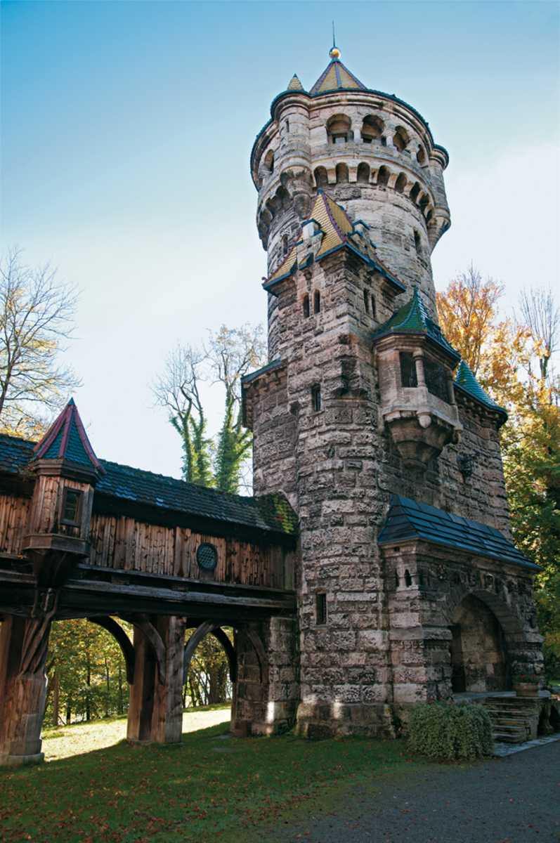 Links oberhalb des Ufers steht der Mutterturm. Sir Hubert von Herkomer, renommierter deutsch-britischer Maler und Bildhauer ließ ihn 1884 als Atelierturm zum Gedenken an seine Mutter erbauen. Wir gehen links am Turm vorbei und erblicken dahinter das Museum, in dem Gemälde und Werke Herkomers verwahrt werden und von dem aus man auch den Turm betreten kann.