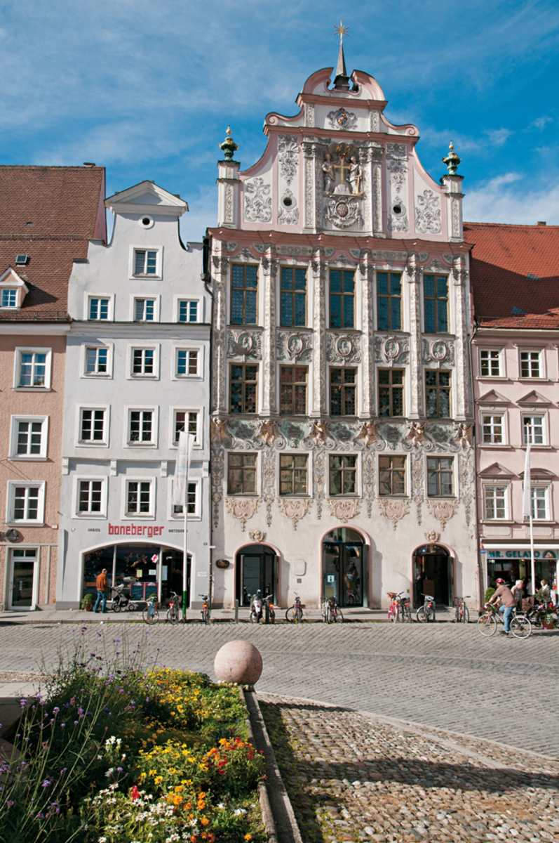 Erst gehen wir ein paar Meter links, dann rechts am Flussufer entlang. Links stehen die Gebäude des ehemaligen Ursulinenklosters. Es wurde ab 1719 als weibliche Ergänzung zum Knabenkolleg der Jesuiten begründet, 1764–66 entstanden in heutiger Form Klosterkirche und Fassadenmalerei. Wir können sie sehen, wenn wir an der nächsten Kreuzung links ums Eck gehen. Ansonsten überqueren wir rechts die Lechbrücke und spazieren rechts am Ufer entlang (zum Bahnhof geht es nach der Brücke erst geradeaus und später rechts). Noch einmal blicken wir rechts auf Lechwehr und Stadtkulisse, ehe wir wieder unseren Parkplatz erreichen.
