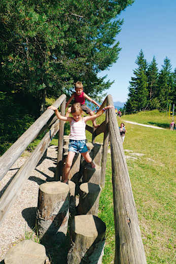 Los geht’s über die „Fußtapsenstrecke“ und erstaunlich weiche Fichtenzapfen, bevor man zu einem natürlichen Matschbecken hinunterkommt, in dem die Kinder schon mal bis zu den Knien einsinken können. Hier ist aber auch eine Umgehungsmöglichkeit über einen Holzsteg vorhanden. Danach läuft man über den Bärentatzenweg zum Wackelbalken im Wettersteingebirge, den im Jahr 2009 sogar der damalige bayerische Gesundheitsminister Markus Söder mit Bravour gemeistert hat, und erreicht dann die Aussichtsstation mit zwei Rastbänken.