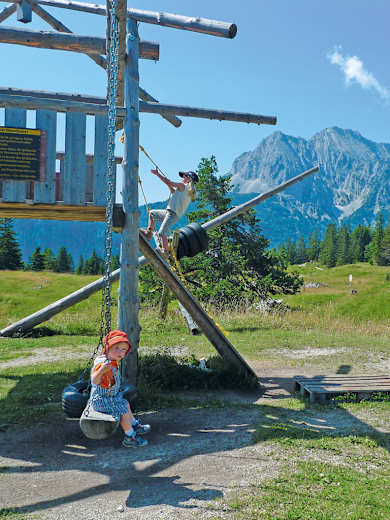 Wir starten direkt am Kassenhäuschen an der Talstation der Kranzbergbahn, gehen von dort geradeaus die wenigen Steintreppen hinauf und wandern (unbeschildert) nach rechts auf dem breiten Wiesenweg neben einem schmalen Teerstreifen bergan. Nach etwa 5 bis 10 Min. kommen wir an einer Moorwiese vorbei, folgen weiter ein paar Meter dem breiten Wiesenweg und müssen nun aufpassen: An einem rechts des Weges stehenden Baum, dessen Stamm sich etwa einen Meter über dem Boden in drei Äste teilt, verlassen wir den breiten, sich nach links wendenden Wiesenweg und schwenken nach rechts in einen kaum ausgetretenen Pfad. Wir kommen an einem Farnfeld und mitten in der Wiese stehenden alten Kiefern vorbei und gehen geradeaus hinunter zu einem kleinen Bach. Ein wunderbarer Platz, der zum Verweilen und Spielen einlädt.