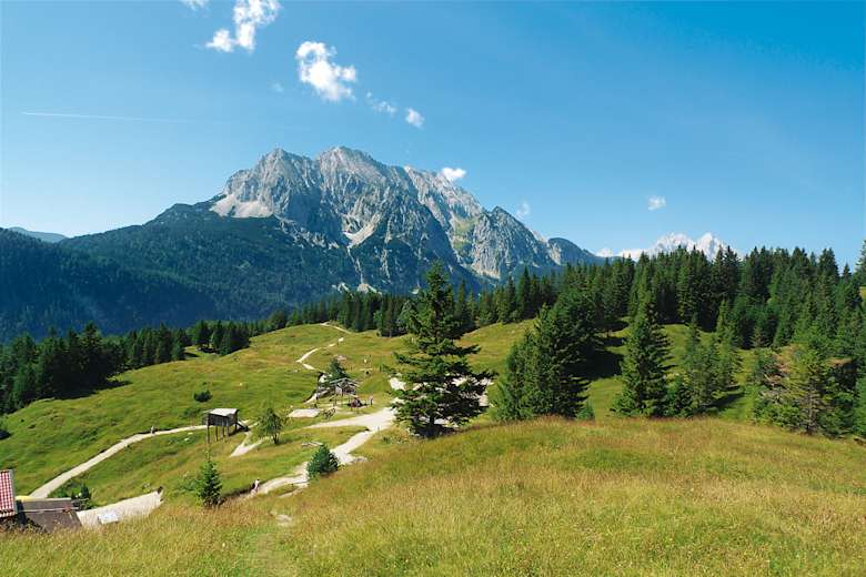 Wir kommen am Kranzberghaus, 1.350 m, und dem dahinterliegenden Spielplatz vorbei und erreichen den Hohen Kranzberg, 1.391 m, mit fantastischer Aussicht auf die liebliche Landschaft mit ihren Buckelwiesen, den Wildensee und die dahinterliegende Bergwelt vom Krottenkopf im Norden über die Benediktenwand bis hin zum Wörner im Osten. Vom Gipfel wandern wir wieder hinunter zum Spielplatz, gehen mit herrlichem Blick auf das Wettersteinmassiv rechts an diesem vorbei und folgen auf dem nicht allzu breiten Kiesweg der Beschilderung zum Lautersee.