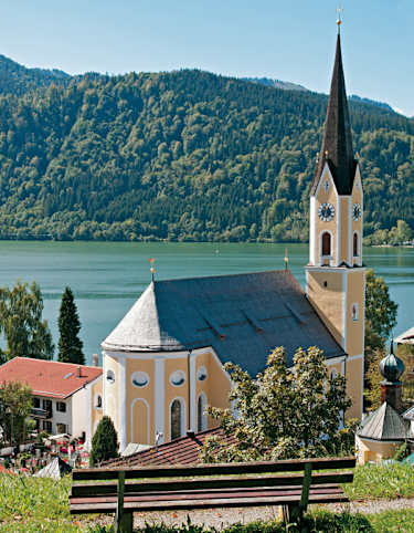Wieder überqueren wir ein Rinnsal und gehen über Wurzeln geradeaus weiter steil hinauf. Nach 20 Min. kreuzen wir erneut einen Wirtschaftsweg. Wir freuen uns über das Schild „Neureuth“, zeigt es uns doch, dass wir noch richtig sind, und folgen diesem in den Wald. Nach weiteren 20 Min. betreten wir durch einen Zaundurchlass eine Wiese und kommen weglos – vorbei an einer Bank – auf den schönen Wiesen-Almweg, der von Tegernsee heraufführt. Wir wenden uns nach links, die Kinder stürmen den herrlichen, leicht ansteigenden Wiesenweg zur Neureuth, 1.263 m, hinauf – die Aussicht auf ein Eis im Berggasthof mobilisiert ungeahnte Kräfte. Gelockt von einer ganz anderen Aussicht – auf den Tegernsee und seine südlichen Berge – legen nun auch die Erwachsenen einen Schritt zu und so erreichen wir nach wenigen Minuten das Gasthaus.