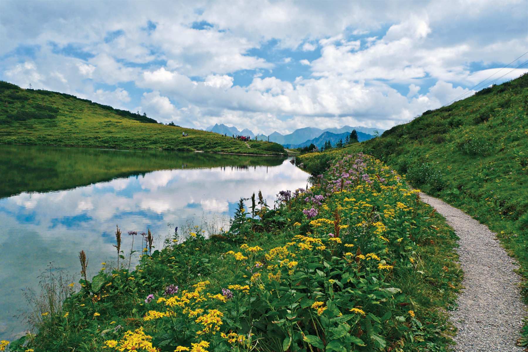 Ein Gratweg führt uns schnell hinüber zum Aussichtspunkt Rote Wand, an dem zwei große Gipfelbestimmungstafeln auf uns warten. Von hier geht es nun nach rechts auf einem Bergsteig gestuft über einen blumenreichen Hang in Serpentinen zum angelegten (Wasserreservoir für die Schneekanonen) Riezler Alpsee hinunter. Dort führt wiederum direkt an unseren Weg anschließend scharf links ein weiterer Pfad unbeschildert in Richtung Fellhorn.