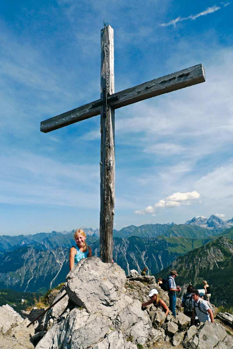 Burmiwasser und malerischer Gebirgssee in den Allgäuer Alpen auf 2.038 m: Der Zwei-Länder-Weg von der Kanzelwand in Vorarlberg zum Fellhorn in Bayern ist breit angelegt und wegen seiner wunderschönen Aussicht sehr beliebt, sodass man hier mit Sicherheit nicht allein unterwegs sein wird. Auf die Familien warten auf dieser Tour nicht nur insgesamt drei Spielplätze und das Burmiwasser (siehe Kinderkasten), sondern auch unterhalb des Fellhorns der malerische Schlappoldsee mit Zugang zum Wasser und eine Einkehr in der schön gelegenen Alpe Schlappold mit ihren Tieren.