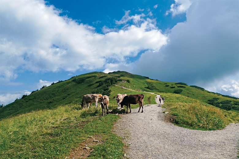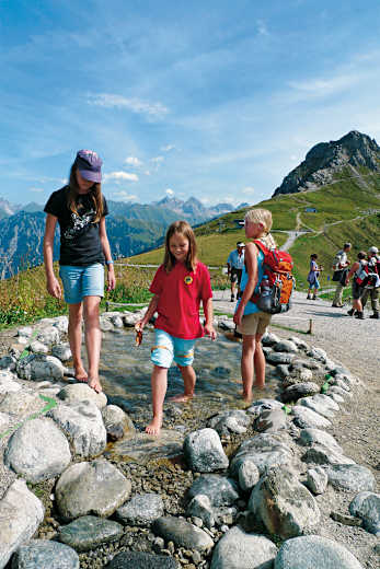 Zu Beginn und bei unserem Abstecher zur Alpe Schlappold können wir auf kleine Bergsteige und Pfade ausweichen, sodass auch das Naturerlebnis nicht zu kurz kommt. Von der Talstation schweben wir mit der Gondel hinauf zur Bergstation, wenden uns dort scharf links und folgen dem Wegweiser »Fellhorn ü. Rote Wand« unmittelbar an dem Bergbahngebäude entlang. Das Burmiwasser mit seinen vielen Wasserstationen heben wir uns als Attraktion für den Rückweg auf. Ein Gratweg führt uns schnell hinüber zum Aussichtspunkt Rote Wand, an dem zwei große Gipfelbestimmungstafeln auf uns warten. Von hier geht es nun nach rechts auf einem Bergsteig gestuft über einen blumenreichen Hang in Serpentinen zum angelegten (Wasserreservoir für die Schneekanonen) Riezler Alpsee hinunter. Dort führt wiederum direkt an unseren Weg anschließend scharf links ein weiterer Pfad unbeschildert in Richtung Fellhorn. Wir kommen an einer Abzweigung nach Riezlern vorbei, gehen geradeaus weiter und suchen uns einen Weg, der uns trockenen Fußes durch einen Gebirgsbach führt. Hier könnte man eine kleine Spielpause einlegen. Kurz darauf stoßen wir auf einen breiten Wanderweg, biegen links ein und marschieren zwischen den hier oft auf dem Weg stehenden Kühen hindurch zu einer Verzweigung.