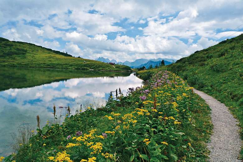 Burmiwasser und malerischer Gebirgssee: Der Zwei-Länder-Weg von der Kanzelwand zum Fellhorn in den Allgäuer Alpen ist breit angelegt und wegen seiner wunderschönen Aussicht sehr beliebt, sodass man hier mit Sicherheit nicht allein unterwegs sein wird.