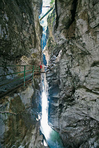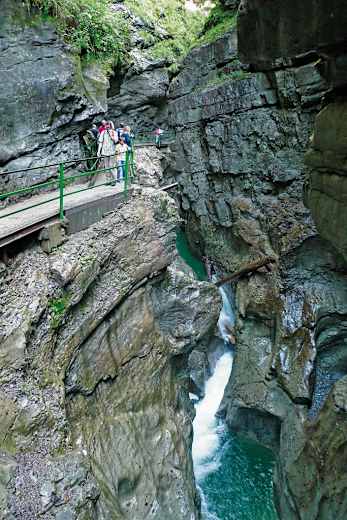 700 m später steht man am oberen Kassenhäuschen der Klamm, geht im spitzen Winkel durch das Drehkreuz und kommt über viele Treppenstufen hinunter in das faszinierende Herzstück der Klamm. Links kann man hier gleich zu Beginn die großen Felsbrocken sehen, die bei dem Felssturz von 1995 in die Klamm gestürzt sind.