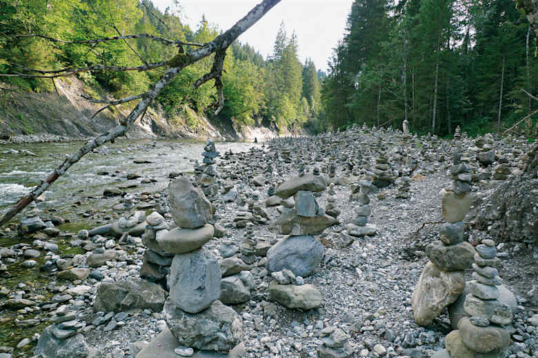 Nach Überqueren der Brücke führt der Weg erst über eine Metallkonstruktion weiter, bevor er dann als Kiesweg neben der Breitach verläuft. Man kommt zu einer gut zugänglichen Stelle am Fluss, an der man bei Normalwasser sehr schön rasten kann, während die Kinder zwischen den großen und kleinen Steinen in Wassernähe spielen können. Die unzähligen Steinmännchen befinden sich noch ein Stück weiter flussaufwärts an einem breiten Kiesstrand. Dort kommt man aus dem Staunen nicht mehr heraus! Eine richtige Steinmännchenarmee erwarten dort im Sommer. Es versteht sich von selbst, dass nun jeder sein eigenes Steinmanderl bauen möchte. Wer schafft wohl die höchste, wer die originellste Konstruktion?