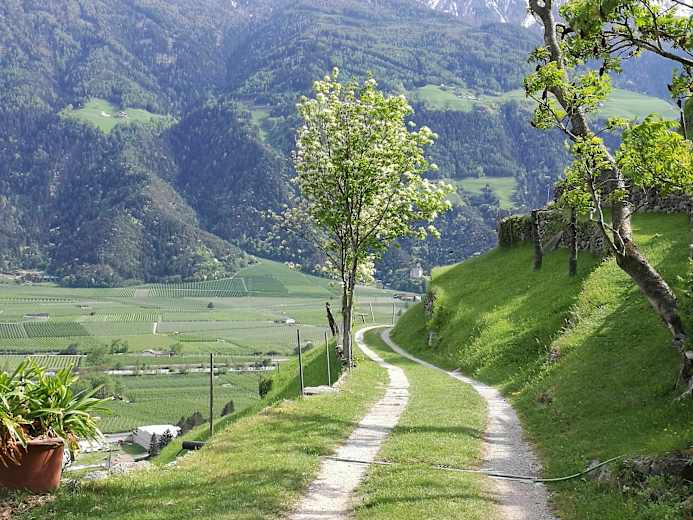Die mittelschwierige Etappe von Rabland nach Naturns über dem Sonnenberger Panoramaweg und dem Wallburgweg kann an sonnigen Tagen ziemlich schweißtreibend sein. Der Wegverlauf am Fuße der Texelgruppe in den Ötztaler Alpen, verspricht ein großartiges Panorama auf die Südtiroler Bergwelt und auf die Obstanlagen in den Talsohlen des Meraner Landes und des unteren Vinschgaus.