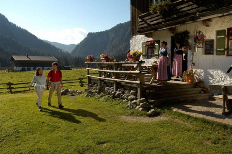 Mittelschwierige, dennoch familienfreundliche Wanderung mit wenig Höhenunterschieden im Gebiet zwischen Ruhpolding und Reit im Winkl in den Chiemgauer Alpen (Bayern). Auf der Alm angelangt, darf man sich eine zünftige Jause schmecken lassen.