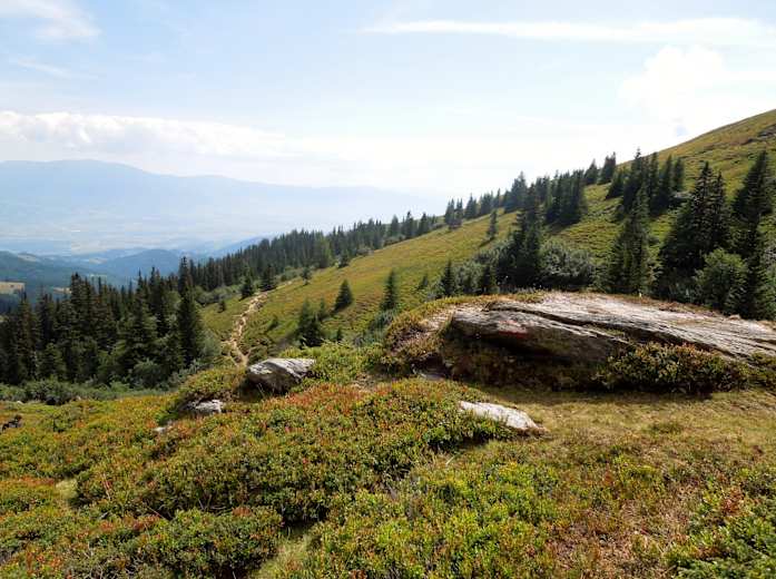 Beim ehemaligen Gasthaus Schranzer geht es über eine steile Wiese bergab. In einer langgezogenen Rechtsschleife quert der Weg eine feuchte Senke und mündet beim ältesten Gasthaus auf der Saualpe. Der Gasthof Petutschnig ist über 900 Jahre alt. Danach wandert man leicht bergauf bis zu einem Bildstock (ca. 800 m). Nun folgt der Wanderweg in sanften Kurven der Straße abwärts bis zum Tormannkogel. Ab Höhe der Abzweigung zur Streusiedlung Tschrietes hat man einen herrlichen Blick auf die Karawanken. Am Tormannkogel verläßt der Wanderweg die Straße wieder und es geht rechts in einen markierten Waldpfad.