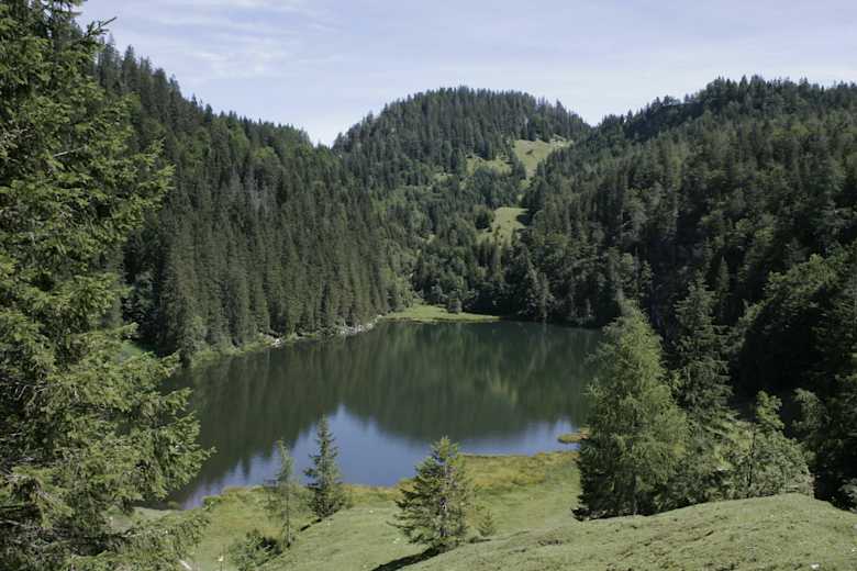 Bleibt man auf diesem Weg kürzt man die Tour ab. Rechts am See entlang führt ein waldiger Steig auf eine Hochalm, auf der die Sauermöseralm liegt. Von hier führt der Weg weiter Richtung Oberwössen bis er auf den direkten Weg vom Taubensee stößt. Über den Luftbodensteig geht es hinab bis zur Forststraße.
