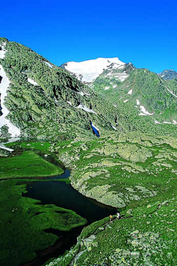 Auf dieser Etappe kann man besonders gut den Einfluss der Gletscher auf die Landschaft und die Felsformationen sehen. Ein landschaftliches Highlight ist das sogenannte „Paradies“, ein Hochmoor, durch dessen sanftes Grün sich ein Gletscherbach schlängelt. Die Schönheit und Stille dieses Ortes machen seinem Namen alle Ehre und belohnen den Wanderer für seine Mühen.