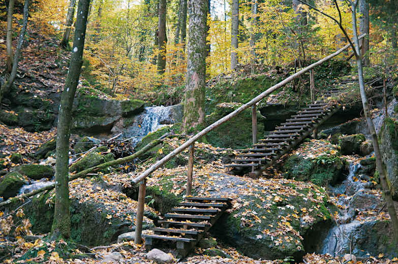 Über Treppen und Stufen geht es am wilden Wasser entlang des Bachs bergauf. Bald nach der Station über Wild und Geweihe geht es durch Wald entlang der linken Böschung über der Schlucht weiter. So erreichen wir den oberen, sanfteren Teil der Schlucht, die bald als kleiner Graben ausläuft. Wir orientieren uns an den Schildern „Jägersteig/Auerberg“ und gelangen schließlich aus dem Wald heraus.