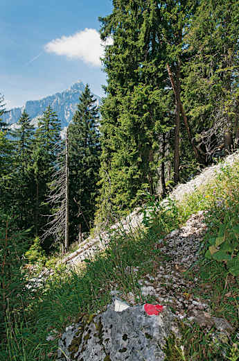 Nachdem unsere Forststraße eine Brücke überquert hat, heißt es aufpassen: Ca. 300 Meter weiter führt die Straße rechts bergauf (Schild „Wasserschutzgebiet“ in umgekehrter Richtung). Hier gehen wir direkt links zum Fluss und überqueren ihn auf Steinen (notfalls Schuhe ausziehen). Gegenüber beginnt der Settelesteig. Der kleine rot markierte Steig führt zunächst etwas verwachsen halb rechts bergauf. Wunderschön und recht steil geht es anschließend hinauf, durch Bergwälder mit Ahornen, über unzählige Wurzeln und durch Felsblöcke.