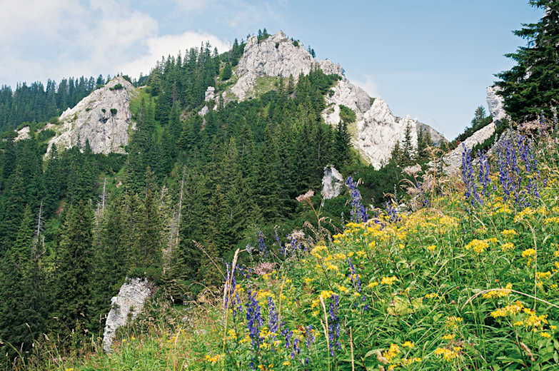 Der Steig quert bald unter den abenteuerlichen Felswänden des Hohen Straußbergs durch und wird zum Teil ein wenig ausgesetzt (z. B. beim Queren eines kurzen Geröllbandes). Bald aber geht es gemütlich durch herrliche blumenreiche Vegetation auf die Nordseite. Wir blicken nun (von rechts nach links) zum Straußbergköpfl und zur Ahornspitze sowie zum Branderschrofen. Die letzteren beiden Gipfel können wir bald mitnehmen.