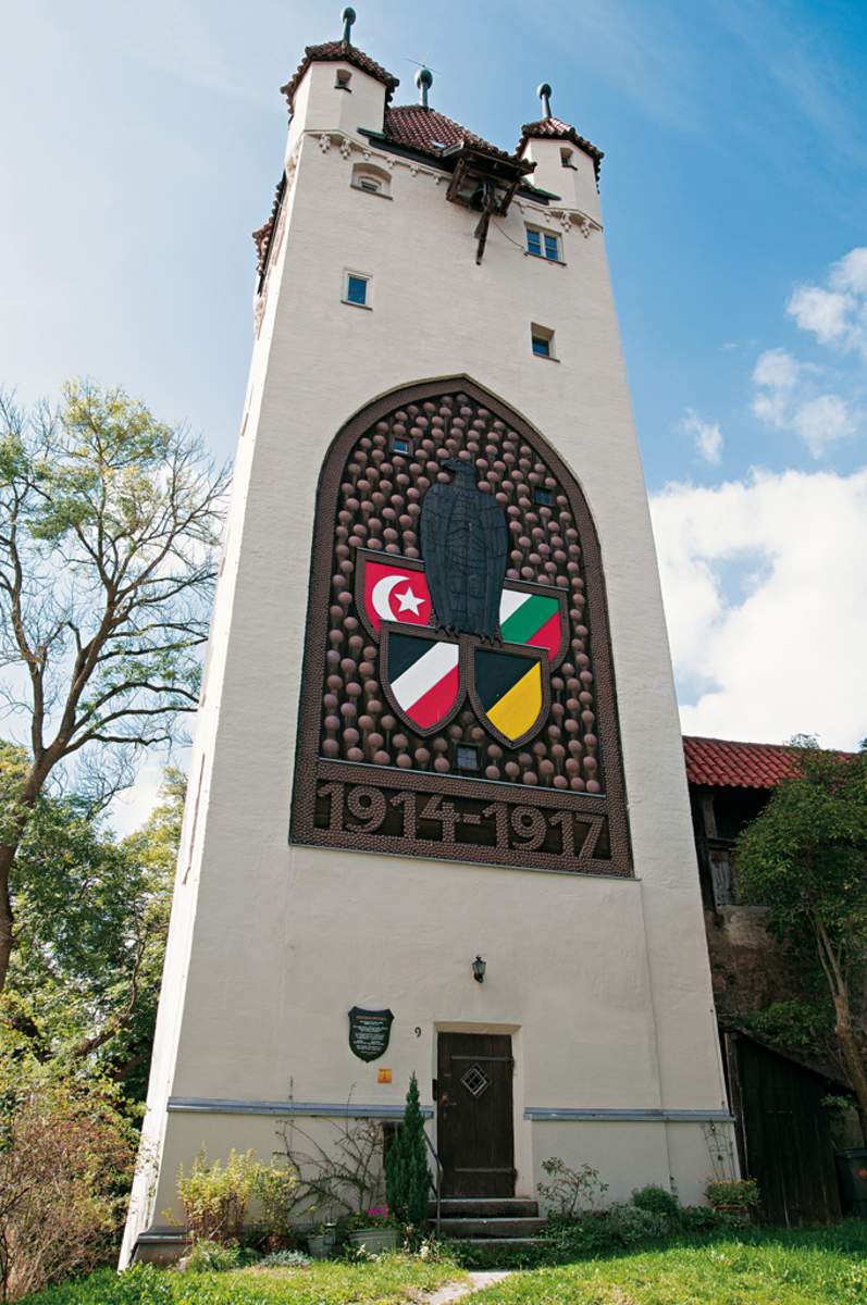 Bald erreichen wir nach dem gleichnamigen Café mit herrlichem Rastplatz den imposanten Fünfknopfturm. Er entstand ebenfalls um 1420 als Befestigungsturm und als Sitz der Feuerwache. Vorne fällt das riesige Wehrschild auf, das im Ersten Weltkrieg mit über 5000 Nägeln geschaffen wurde und Spenden für Kriegsopfer brachte. Die Flaggen zeigen die damaligen Mittelmächte (Deutsches Reich, Österreich-Ungarn, Osmanisches Reich, Bulgarien).