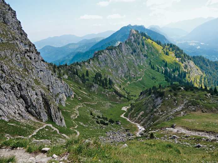 Nach links hinauf gelangt man auf den Hennenkopf und einen schmalen Gratweg mit grandioser Aussicht. Hier gibt es auch die Möglichkeit, direkt auf dem Grat ein paar Gipfel mitzunehmen, in der Folge Dreisäulenkopf (1.629 m), Hennenkopf (1.768 m), Laubeneck (1.758 m) und Latschenkopf.