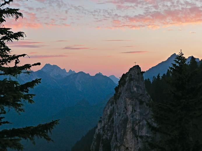 Der Grat steigt schnell wieder an und kurz darauf geht es hoch zum Gipfel der Klammspitze, 1.924 m, mit ihrem beeindruckenden, großen Kreuz. Von hier aus geht es in der Tendenz bergab: Erst durch eine kleine Scharte, dann queren wir die Karmulde, die östlich unterhalb des Gipfels liegt. Schließlich erreichen wir die toll gelegenen Brunnenkopfhäuser, 1.602 m, mit ihrem kleinen Kinderspielplatz.