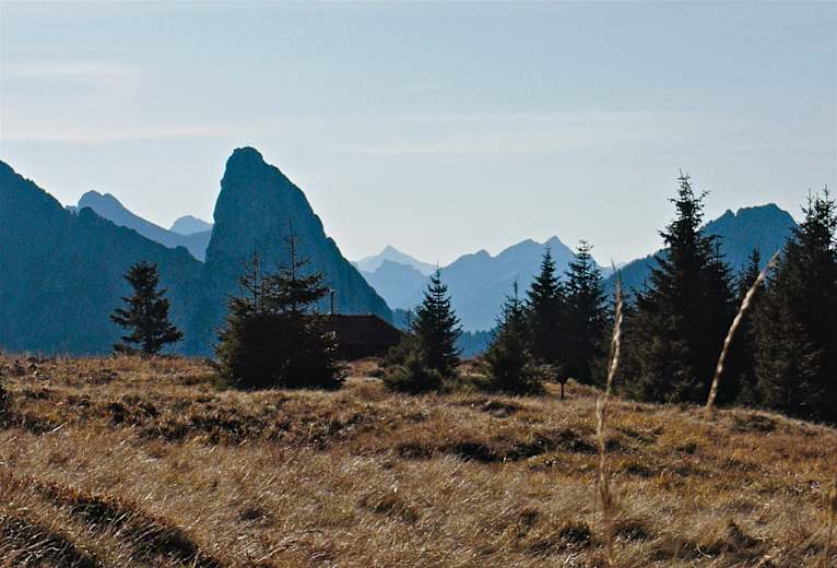 Direkt gegenüber der Kenzenhütte, 1.285 m, startet von der Fahrstraße weg schräg nach links hinauf der Weg zum Bäckenalmsattel, 1.536 m. Es geht eine dreiviertel Stunde kontinuierlich mit mittlerer Steigung und zum Teil schattig hinauf bis zum Sattel, wo sich auch ein großer Wegweiser befindet. Steil geht es nach links auf einem schmalen Pfad hinauf zu der auf einer großen Freifläche stehenden Hirschwanghütte, 1.713 m, einer nicht bewirtschafteten kleinen Schutzhütte.